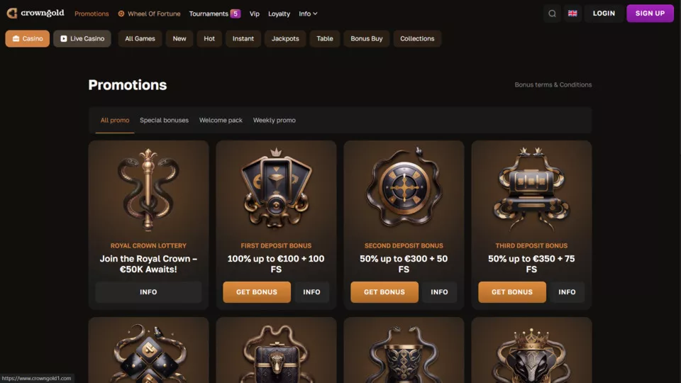 Visitors from Australia can play at CrownGold online casino for real money and get many promotions that are clearly described on the official site of the online casino. In particular, all new gamblers who register an account at CrownGold casino online can get welcome bonuses for their first four deposits. After that, you can benefit from numerous regular promotions, such as: