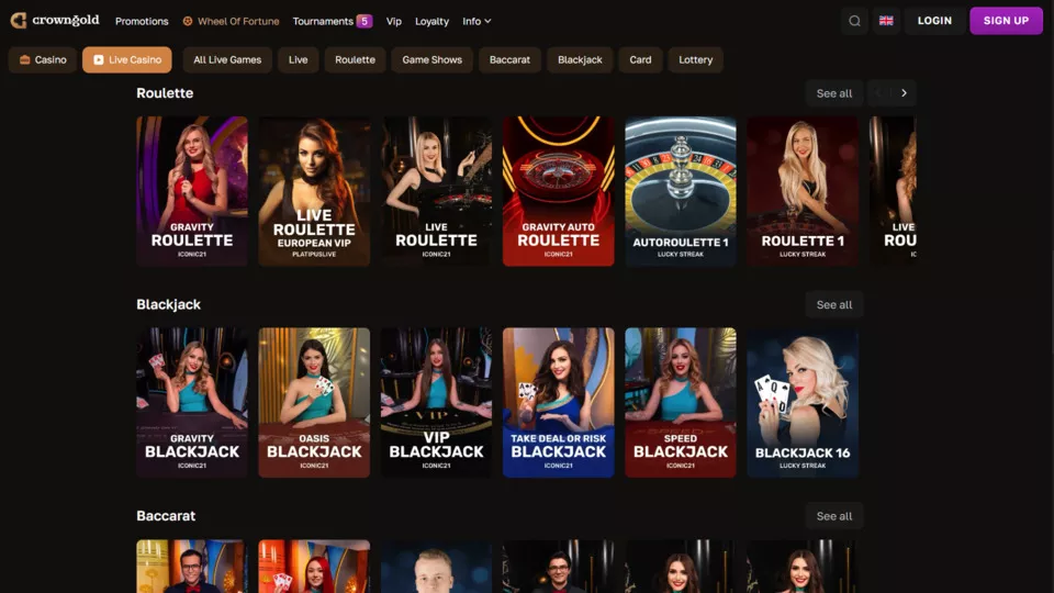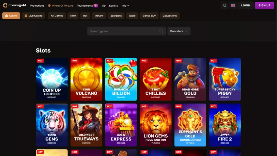 CrownGold casino games collection has more than 9,000 titles from such well-known providers as Playson, Voltent, BGaming, Gamzix, and many others. Here, you will find classic slot machines, jackpots, and modern video slots. In addition, the platform offers other popular casino games, including table games, instant win games, and live casino.