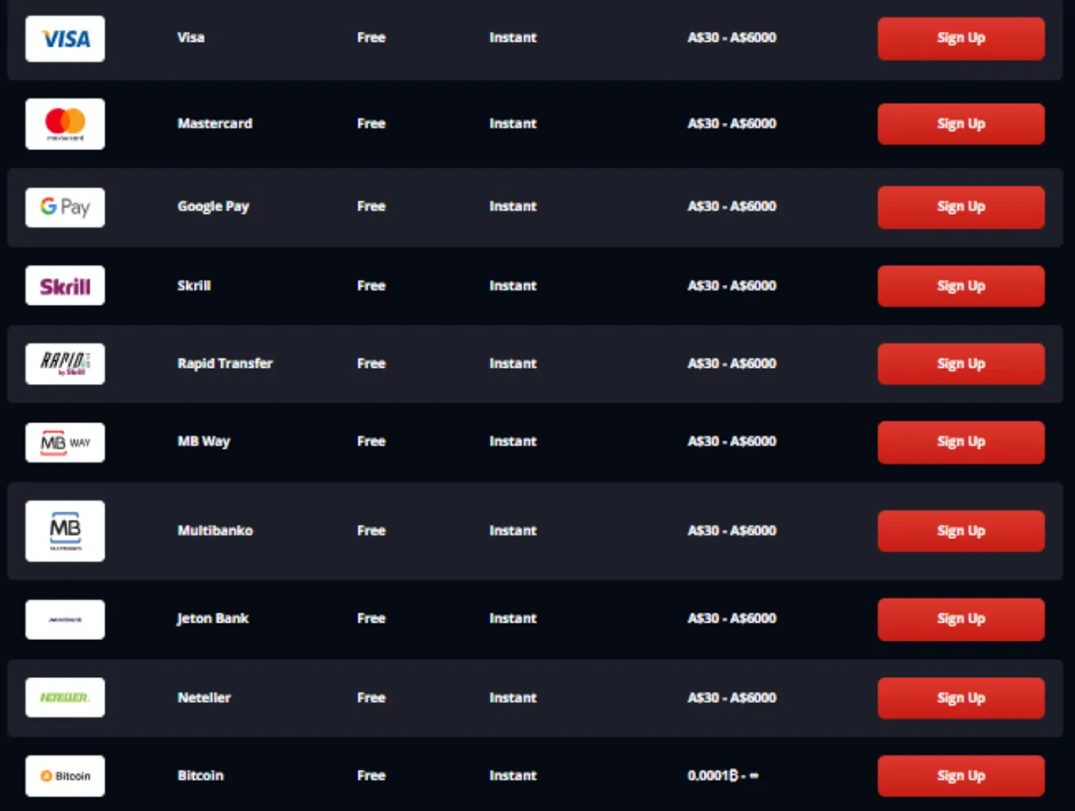 A$30 min deposit / A$1600 max withdrawal