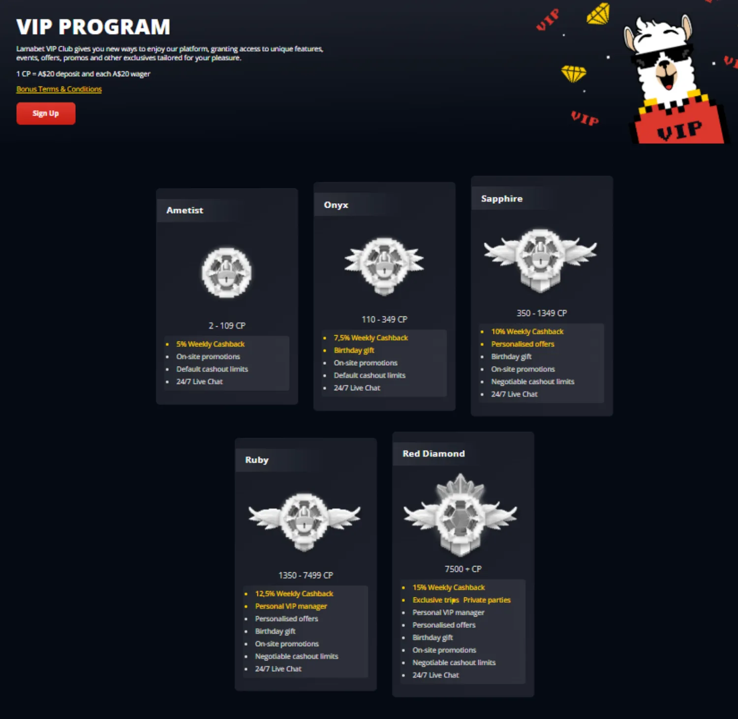 Lamabet rewards regular play through a loyalty program that uses Comp Points. The system is pretty straightforward: every A$20 you deposit or wager earns you 1 CP. These points move you through five VIP tiers, and each level brings better cashback rates along with extra perks.