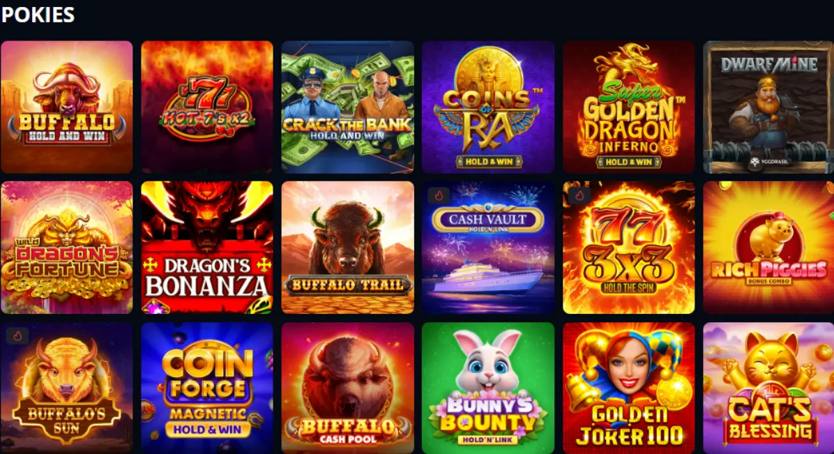 Pokies (slots) take center stage in the casino games section, which makes sense given how popular they are with Australian players. The game lobby is organized into dedicated categories, making it easy to navigate.